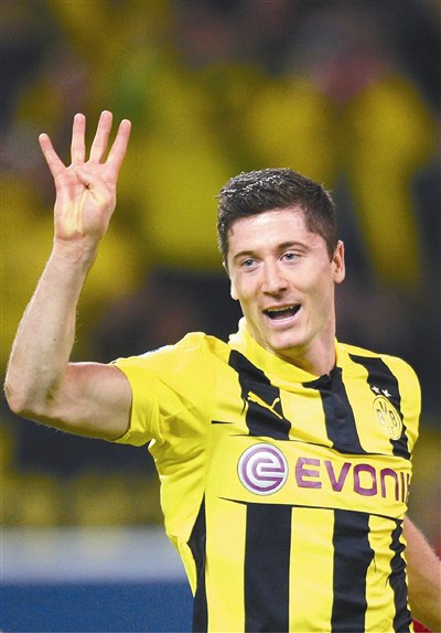 【本報綜合外電報導】右手興奮高舉「四」衝向角旗慶祝,波蘭籍前鋒勒萬多斯基(上圖/美聯社)昨日在歐洲冠軍足球聯賽四強戰單場進四球,助德甲多特蒙德以四比一擊退西甲皇家馬德里,在首回合領先,他也是歐冠四強賽史上,首位單場進四球的球員。