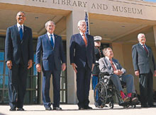 五位美國現任及前總統聚集一堂,是相當難得的場合。上次五位領袖到齊是在二○○九年一月二十日歐巴馬宣誓就職日。歐巴馬總統說,總統圖書館落成典禮被稱為仍健在美國總統「全球獨一無二的俱樂部」,但實際上更像「打氣俱樂部」,只有做過總統的人才知道這個重擔的滋味。他並形容小布希「是個好人」。