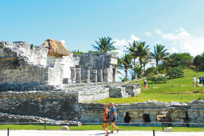 我站在高處遠眺碧藍的加勒比海,想像馬雅時期精緻文化的生活,再回首仰望高塔般威風凜凜的神殿,讚嘆馬雅古曆的精準嚴謹,不同於埃及空心建造作為帝王陵寢的金字塔,馬雅文化金字塔塔頂是作為教士居住和觀察天象之用。