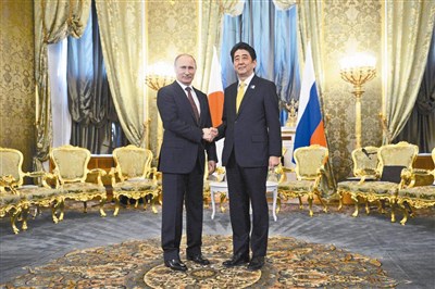 十年來首次日本現任首相訪俄,安倍於二十八日晚間抵達下著小雨的莫斯科,昨天與普亭會晤。普亭於會談開始時說,兩國關係慢慢發展中,「但以俄羅斯和日本這樣的大國而言,這樣的關係還不夠緊密」。安倍也呼應,說兩國的潛力還沒發揮到極致,日本與俄羅斯結盟為夥伴的合作關係,是與時俱進的發展。