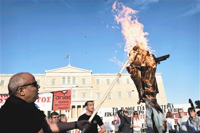 為取得歐盟的紓困貸款,希臘通過裁減公務員法案,推翻維持一百多年的終身工作保障制度,二十八日有八百多名民眾聚集在希臘國會前抗議。圖/法新社
