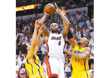 【本報綜合外電報導】美國職籃NBA邁阿密熱火「小皇帝」詹姆斯搭配韋德,以九十九比七十六擊敗印第安納溜馬,連續第三年挺進總冠軍賽。