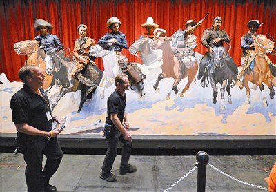 活生生 複製名畫美國加州拉古納灘每年夏天舉辦為期八周的「大師節」,最大特色是呈現的「活生生的圖畫」。這項年度盛事以真人重新呈現經典或當代藝術作品,演員的穿著打扮、背景與原版畫作幾乎完全相同。上圖為去年六月三日預演雷明頓的「衝向樹林」,下圖為藝術家們正在演員