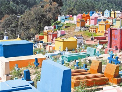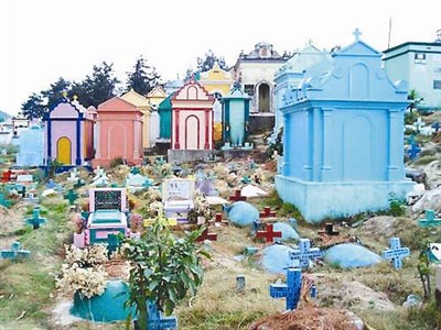 瓜地馬拉人熱愛色彩,不同的顏色代表種族、信仰或者是家族喜好,他們不但會把住家牆壁刷上鮮艷的顏色,連往生後住的墓園,也是色彩繽紛,圖為奇奇卡斯特南戈鎮(Chichicastenango)的彩色墓園。