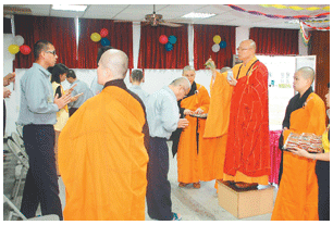 心定和尚以生動感人的小故事,勉勵受刑人時時關照自己,淨化身心,常存感恩心對父母孝順,凡事需有因緣果報的觀念,學習以尊重包容體諒的心與人相處廣結善緣,並以「榕樹下」、「綠島小夜曲」等曲調,穿插教唱佛教歌曲,最後為每位皈依者,進行甘露灌頂儀式,受刑人虔誠低頭受禮,那份恭敬專注的神情,令人感動佛法憾動人心的力量。
