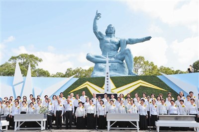 八月九日是日本長崎遭原子彈轟炸六十八周年紀念日。圖為當天在長崎和平紀念公園,市民在紀念儀式上合唱。