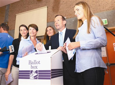 艾波特(右二)七日在妻女陪同下,在雪梨的投票所投下個人的一票。圖/法新社