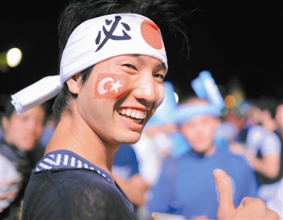 一名前往土耳其旅遊的日本遊客,在獲知東京取得二○二○年奧運承辦權後,高興的在伊斯坦堡街頭上慶祝。圖/美聯社
