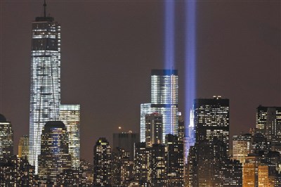 九一一12周年 為紀念「九一一」恐怖攻擊十二周年,紐約市下曼哈坦區的「四號世貿中心」(中)和「一號世貿中心」九日測試預定在十一日表演的燈光秀。圖/美聯社
