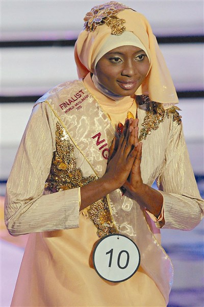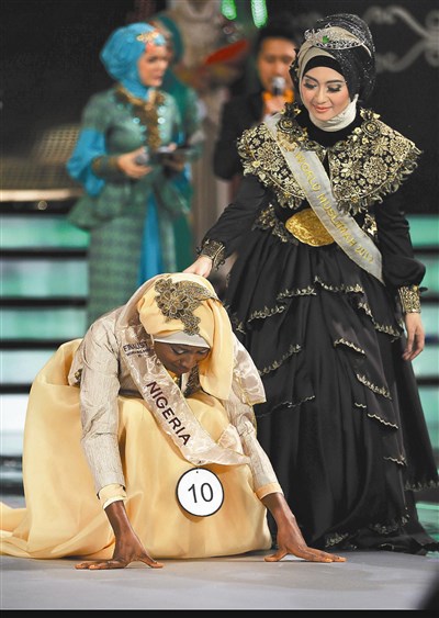 【本報綜合外電報導】「二○一三年世界女穆斯林選美」在印尼雅加達舉行,不同一般穿泳裝的選美,穿戴穆斯林頭巾、全身包緊緊的二十名佳麗PK誦經、伊斯蘭與生活機智問答,最後由二十一歲的奈及利亞佳麗艾吉波拉(Obabiyi Aishah Ajibola)摘下后冠。