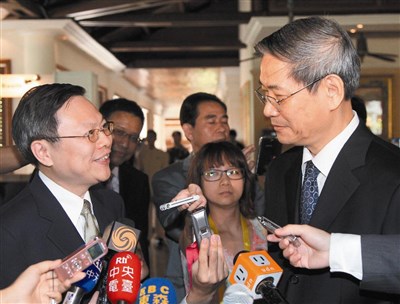 我國APEC領袖代表蕭萬長昨天與中國大陸國家主席習近平舉行會談,兩人會前握手致意,互稱「先生」。會後,陸委會主委王郁琦(左)與大陸國台辦主任張志軍(右)彼此短暫交談,並以對方官銜互稱。圖/中央社