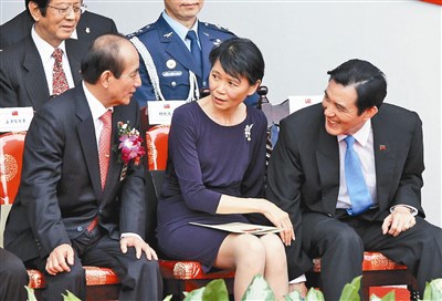國慶大會中,馬總統(右)和立法院長王金平(左)就坐後原本沒有互動,總統夫人周美青(中)一改「酷酷嫂」形象,多話又愛笑,坐在兩人之間帶動氣氛,成了最佳潤滑劑,三人多次交談。圖/曾吉松