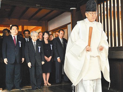 【本報綜合外電報導】日本總務大臣新藤義孝與一百五十九名國會議員,周五參拜備受爭議的靖國神社。人數是一九八九年以來,僅次於今年四月春祭(一百六十六人)的紀錄。參拜的國會議員所屬政黨包括自民黨、民主黨、日本維新會、大家的黨、生活黨、新黨大地等政黨。