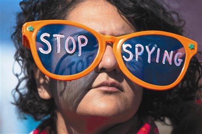 美國華府一名女子戴著超大墨鏡寫著「停止間諜活動」,抗議國安局的監聽行動。圖/法新社