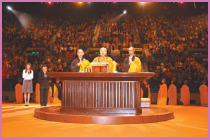 【記者黃映禎、人間社記者趙世明台北—香港連線報導】佛教的清規戒律有如俗世的法律一樣,約束佛教徒的言行舉止,佛光山開山星雲大師昨天起一連三天在香港紅磡體育館第一場佛學講座,主講「人間佛教的戒學」,由佛光山教育院院長慈惠法師擔任提問人,代表現場觀眾提出十大問題,請大師針對戒律的制定、精神等多重方向為大眾開示,並由有線電視及互動電視網頁同步轉播,數以萬人同沾法益。