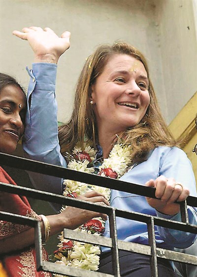 2004年,梅琳達‧蓋茲(右)赴印度加爾各答訪問時,邊揮手向群眾致意,邊接受一名印