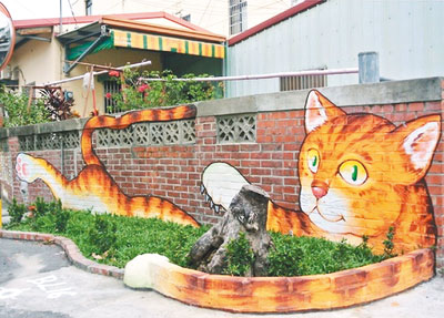 【本報雲林訊】虎尾頂溪社區「屋頂上的貓」彩繪(圖/蔡維斌)在網路爆紅,吸引不少遊客,成為雲林新景點。古牆老屋有了貓咪彩繪,變得生動活潑,讓人宛如回到古早庄腳,這個貓世界是社區理事長鄭坤福和老友田榮鈐共同創作,兩人曾都是電影看板畫師,他們沒想到一隻貓竟能改變社區命運。