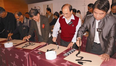 四十六名書法精英昨日在「高雄.美術—書法象線」會場,集體揮毫書寫「高」字,希望高雄展翅高飛,成為國際書法之都。圖/中央社