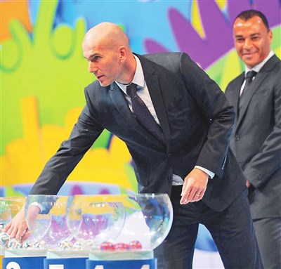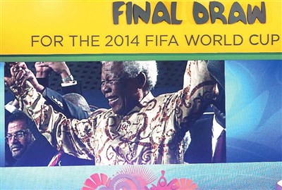 二○一四年巴西世界杯分組抽籤儀式,六日在巴西東北部巴伊亞州沙威培海岸舉行。上圖為法國球星齊達內在儀式上抽籤。左圖為現場播放視頻短片,向已故南非前領導人曼德拉致敬。 圖/新華社