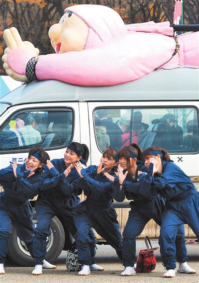 日本三重縣伊賀市八日起舉辦一連兩天的「伊賀上野忍者節」,圖為遊客穿著忍者服,與貨車上的忍者玩偶合照。  圖/法新社