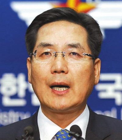 南韓國防部發言人金 奭八日在首都首爾的記者會中,說明南韓新擴大畫設的防空識別區範圍。