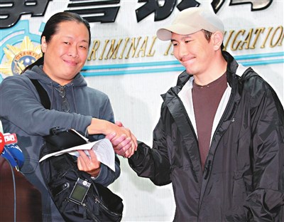 張大公(左)昨日下午在刑事局舉行記者會,感謝共同出席記者會的友 人余靖(右)居間協調救援任務並當場和他握手致意。 圖/中央社