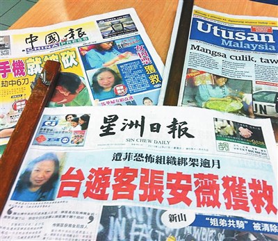 大馬各大報章昨日紛紛在頭版刊登張安薇獲救消息,並盛讚大馬軍警與菲律賓保安部隊密切合作,才讓這次拯救活動寫下菲律賓近幾年最快紀錄。 圖/中央社