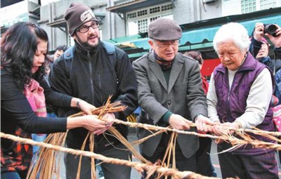 頭城鎮更新社區邀請耆老在現場指導遊客編織草蓆、交股草繩與製作竹筒響鈴。