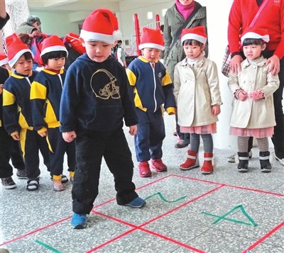小朋友玩跳格子,因不懂遊戲規則,不知道要跳到 哪一格,模樣天真可愛。 圖/張郁國
