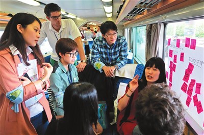競賽團隊各提出具科技含量及商業 模式的解決方案。火車啟動時,學員立刻組裝桌子、旋轉椅子,開始一連串討論,雙方你來我往,邊談邊將思考便利貼黏在窗戶上。疲倦時,學員眺望花東美麗的海景,轉換心情後再回到討論場上。
