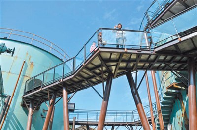 【本報台南訊】百年仁德糖廠文創大變身,三座保存糖蜜的蜜罐倉庫,以長長的玻璃光雕空中步道串聯,變身為文創館,遊客可到五層樓高的糖罐屋頂,享受三百六十度環繞景觀,遠眺奇美博物館,看日出、賞夕陽,是工業遺址活化一大創舉,將在今晚平安夜啟用。