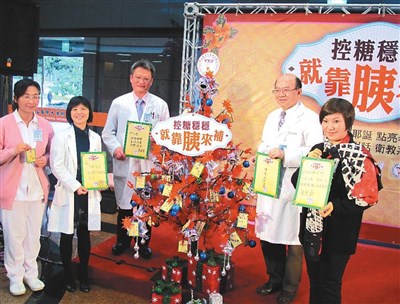 台灣糖尿病人口超過一百七十萬人,中山醫學大學附設醫院及歌仔戲演員唐美雲(右)昨天攜手響應「控糖穩穩 就靠胰來補」衛教活動,點亮「控糖穩穩希望之樹」,為糖友寫下祈福卡。還獻出自創「控糖穩穩」專屬戲碼,鼓勵糖友與醫師、衛教師共組黃金三角,勇敢面對治療。