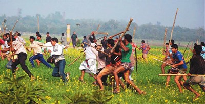 孟加拉反對派六日拿著棍棒,在首都達卡西北方的拉傑沙希專區,追打執政黨「人民聯盟」支持者。 圖/美聯社