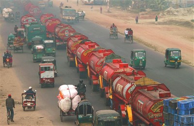 孟加拉反對派六日起發動四十八小時全國大罷工,圖為警方當天在首都達卡護送一列油罐車。 圖/美聯社