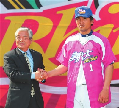 義大犀牛隊昨為新秀進行加盟儀式,左投黃勝雄(右)簽約金四百萬元,球團董事長吳承璋(左)親自為他披上球衣。 圖/中央社