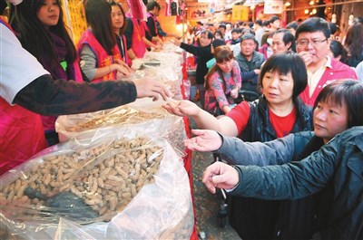 台北迪化商圈年貨大街昨天開跑,整條大街的商家莫不使出渾身解數,招呼客人免費試吃,以刺激買氣。 圖/中央社