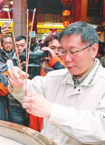 柯文哲昨天到松山慈祐宮參拜並發送春聯,他表示將在二月請假,投入北市選戰。 圖/曾吉松