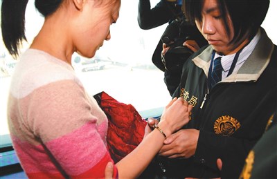 潛逃英國的前軍情局中尉葉玫(左)遭英國政府全程戒護遣返,昨天下午抵達桃園機場,下機後立即由台中地檢署檢察官指揮調查局調查官接押上銬,隨即解送台中地檢署歸案。圖/中央社