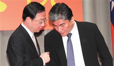 行政院長江宜樺(左)與內政部長李鴻源(右)昨天上午舉行臨時記者會,宣布對新修正的地政士法提出覆議案,以免衝擊房價實價登錄制度。他也說,針對地政士法提覆議,無關內閣改組,不是針對相關閣員討論責任問題。記者會前,江宜樺特地與李鴻源做簡短的溝通。圖/黃義書