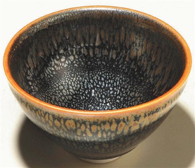 金色鷓鴣斑特色是輕輕撞擊發出金屬般宏亮迴音,油滴斑紋呈現金、銀、藍、橙、綠色等曜光,碗口呈現金色、稱之為「金扣」,非常珍貴。
