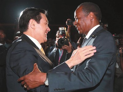 馬英九總統(左)出訪非洲及中美洲三友邦,二十五日晚間抵達布吉納法索,布國總統龔保雷(右)親自接機。 圖/中央社