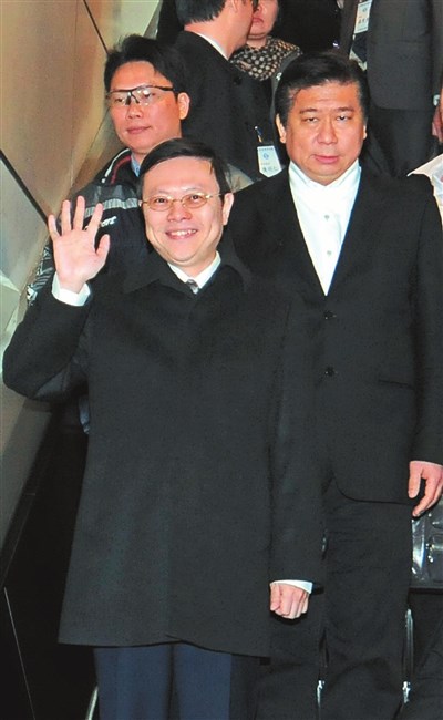 陸委會主委王郁琦(前)昨天結束「王張會」搭機返台,副主委張顯耀(後右)前往桃園機場歡迎接機。王郁琦表示此行結果圓滿順利。 圖/盧振昇