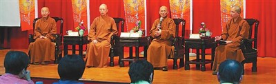 「從《維摩詰經》談幸福安樂之道」論壇則由青年總團副執行長覺屏法師主持,慧僧法師以「還債與還願」的消極、積極面看待人生態度,以及禪師要弟子購買鳳梨的公案,談及如何轉煩惱為菩提。