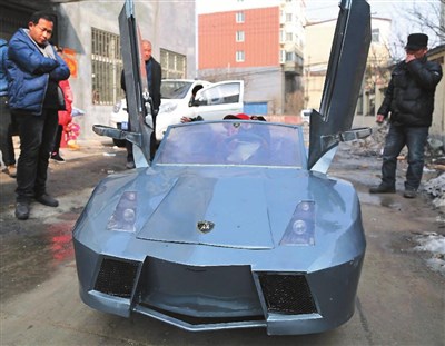 在中國河南鄭州,一輛「迷你」敞篷式「林寶堅尼」跑車,吸引了眾人的目光。這輛「豪車」是五十多歲的農民郭大爺歷時半年,耗資五千元人民幣(約台幣兩萬五千元)自己動手打造的。(圖/路透)