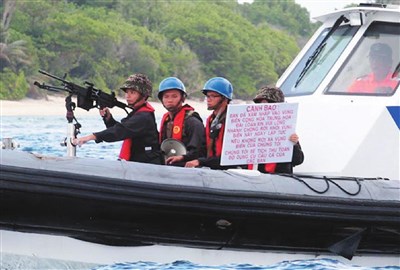 南沙海上執行漁船驅離任務,太平島海巡女兵荷機槍入列。圖中於艇首持機槍戒備、持喊話器皆為女兵,艇上還有外文驅離告示牌。 圖/海巡署提供