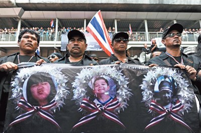 泰國反政府示威者在皇家泰國警察總部之外,舉著在襲擊事件中遇害兒童的遺像控訴。圖/法新社