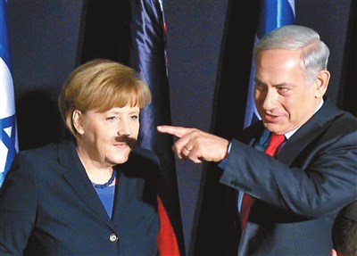 德國總理梅克爾二十五日與以色列總理納坦雅胡召開記者會。納坦雅胡點名記者提問時,手指陰影剛好在梅克爾人中上,活像似希特勒的招牌小鬍子。這張照片流出後,立刻在網路瘋傳。有人認為這張照片,可能是十年來,意外拍到的政治新聞照片當中,最好笑的一張。 圖/法新社