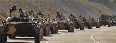 俄軍的裝甲運兵車,十日行經克里米亞半島的港口城市塞凡堡附近。 圖/路透
