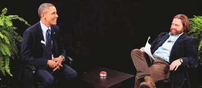 為了鼓勵年輕人投保,歐巴馬與F u n n y o r D i e網站合作,接受《醉後大丈夫》(T h e H a n g o v e r)系列電影的諧星查克葛里芬納奇(Z a c hG a l i f i a n a k i s)專訪。
