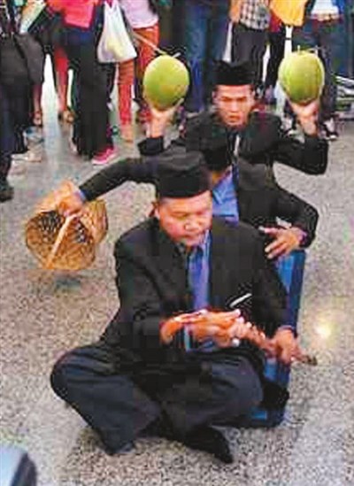 馬來西亞巫師伊布拉欣(右一)十二日再次前往吉隆坡國際機場,並透過瓷壺、竹籃及葉子等材料作法,以期能找到馬航失聯客機下落。 圖/法新社、中央社